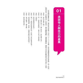 本書共有47堂課,從初次見面破冰、自我介紹、簡報、面談,到親子溝通、伴侶相處、衝突緩解、同事協調,每一堂課都對應生活中的實際情境。