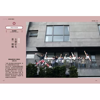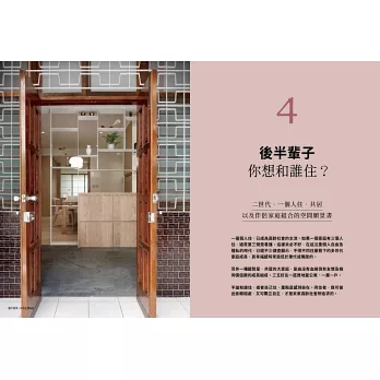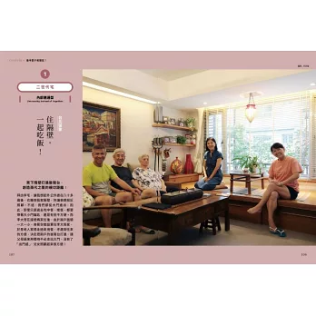 書中走訪了8組不同的家族、家庭、伴侶。有把父母接來住在對門,再將後陽台打通可以自由進出一起吃飯,卻又各有彼此隱私與生活的例子;有五個從年輕就是好友,成年成家後約了一起蓋房子,準備相伴共居共老的親密與信任;有從城市搬遷到鄉間,透過庭園與空間「算計」,讓婆婆感到有人陪、被需要,連原本的三高都消失的實例。