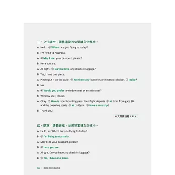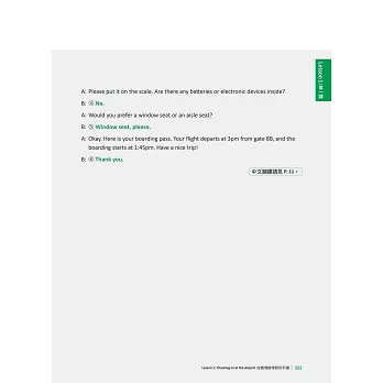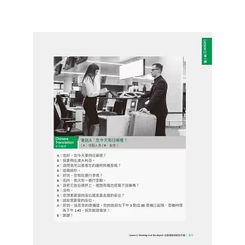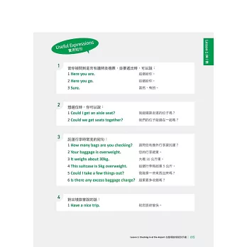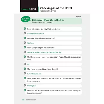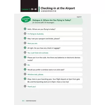 每課都有1~2篇旅遊情境會話,並隨附中文翻譯,不只方便老師備課、帶課堂活動,同學之間也能用角色扮演的方式互相練習。