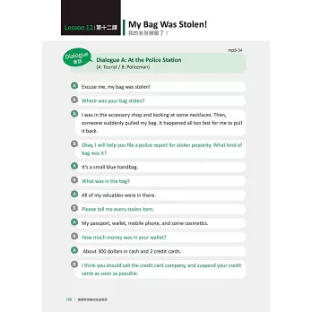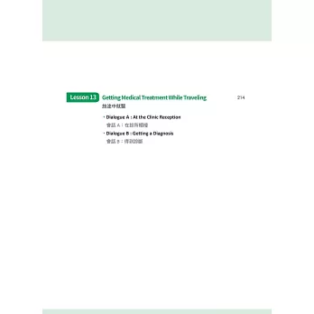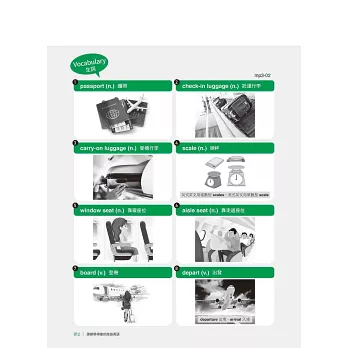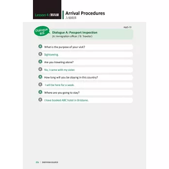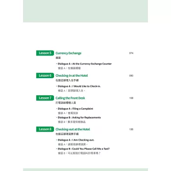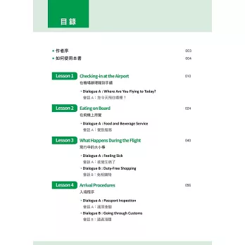 本書共13課,模擬旅遊時會遇到的各種情境,從走入機場開始,過海關、點飛機餐,到當地後,再搭計程車、入住飯店,需要報案、就醫也不怕開口,遇到突發狀況不緊張!