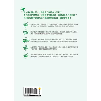 本書的每一課都有會話、生詞、實用短句、文法和練習,用完整的學習步驟,帶您從聽說模仿開始、了解重點到能信心十足地開口說英語,一起來看看吧!