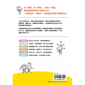 表達方式都是耳濡目染養成的,當孩子經常處在言語正向、態度溫和、邏輯分明、鼓勵發言的環境中,自然會模仿並內化成自己的語言素養和表達自信。本書集結依柔老師多年來的教學經驗,搭配實用的練習方法和互動影音QRCode,鼓勵師長陪伴孩子共同練習—讓孩子的聲音被聽見,打開連結世界的大門。