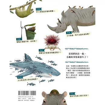 這本插圖精美、內容引人入勝的書籍,將顛覆您對「共生=互利」的既定刻板印象。根據現代生態學的觀點,共生是指兩個不同物種間持續且密切的互動關係,無論雙方互利、單方受益,甚至一方受害,皆屬共生現象。此書內容多采多姿,臚列了很多動物界你所不知道的共生現象。透過本書,您將輕鬆探索自然界中多樣的共生形式——從海洋、森林到日常環境,動植物的關係比想像更豐富!── 黃文山(國立自然科學博物館 館長)
