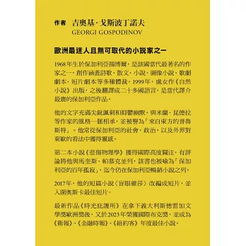◆這是一部關於時間本身的編年史──這正是保加利亞當代最傑出作家戈斯波丁諾夫在《時間庇護所》中所展現的雄心壯志。這部作品於新冠疫情席捲歐洲前夕在柏林完成,讀來不時讓人感到一種不安的先知感,彷彿對身體、政治乃至形而上層面的「感染」提出警告。