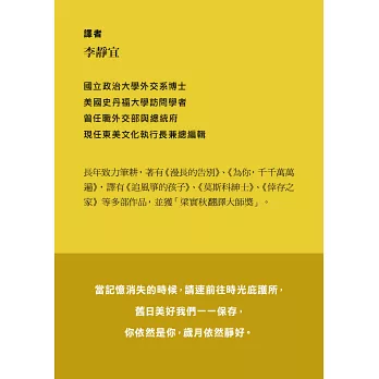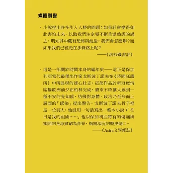 ◆《時光庇護所》是一場穿越時間與記憶的奇幻之旅,一部文筆優美且創意豐富的沉思之作,探問過去對我們意味著什麼,我們是否能重新找回它,以及它如何定義我們的現在。這是為這個幽閉、無時間感的時代所準備的完美小說。──亞貝托.曼古埃爾(Alberto Manguel),《閱讀的歷史》作者、藏書家
