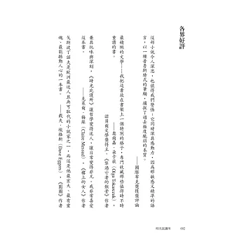◆最精緻的文學……我把這書放在書架上一個特別的格子,專門收藏那些值得時不時重讀的書。──奧爾嘉.朵卡萩(Olga Tokarczuk),諾貝爾文學獎得主、《犁過亡者的骸骨》作者