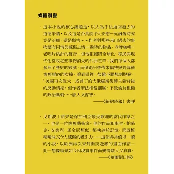 ◆這本小說的核心議題是,以人為手法返回過去的道德爭議,以及這是否真能予人安慰──沉溺舊時究竟是治癒,還是傷害……作者對那些來自過去的事物懷有同情與感傷之情──過時的物品、老牌咖啡、老唱片跳針的聲音──但他拒絕將全球化、移民與現代化當成這些事物消失的代罪羔羊;我們每個人都參與了歷史的毀滅,而倒退只會帶來偏狹與對傳統懷舊庸俗的吹捧。讀到這裡,很難不聯想到脫歐、「美國再次偉大」或普丁的大俄羅斯復興主義背後的反動情緒,但作者筆法相當細膩,不致淪為粗糙的政治諷刺……感人又睿智。──《紐約時報》書評