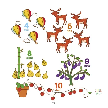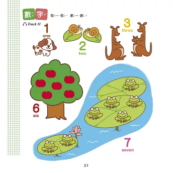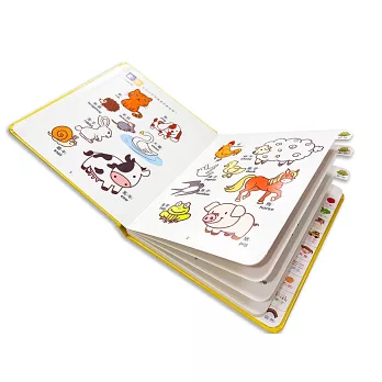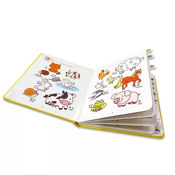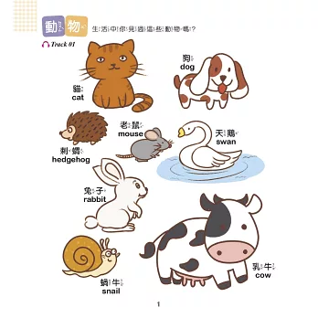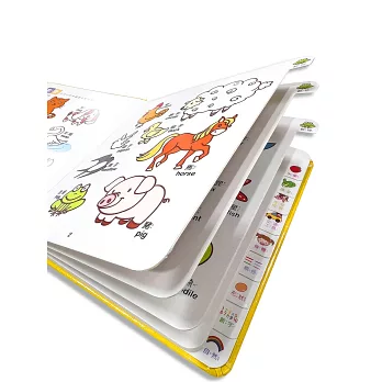 本書涵蓋12個生活主題,從日常中最常見的事物開始幫孩子認識基礎單字,例如cat(貓)、dog(狗)、apple(蘋果)等,從動物到植物,從顏色到數字應有盡有,孩子每天看到、摸到、吃到的,全部都收進這本書裡!