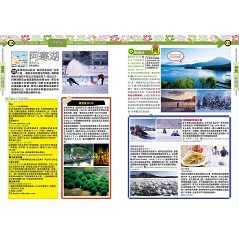 北海道除了賞景還能怎麼玩?前進以冰雪打造的湖上村「然別湖」鑿冰杯、享受冰上溫泉,教你在阿寒湖、摩周湖、知床五湖試試雪上健行、冰上垂釣、雪中烤肉、欣賞冬季限定冰花景色,當然還有夏日各地的熱力祭典資訊,以及圓山動物園、旭川動物園及六花亭等必訪景點名店的亮點介紹,讓你不再錯過!