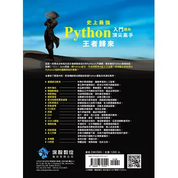 全書有超過1250 個實例、檔案與程式搭配超過530 個模組的函數,輔助約280 個習題與檔案,外加130 頁的習題電子書,用極深入、最詳細的態度講解Python 語法的基礎與進階知識,例如:utf-8 中文編碼、list、tuple、dict、set、bytes、bytearray、closure、lambda、Decorator、@property、@classmethod、@staticmathod⋯等。