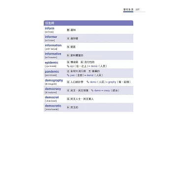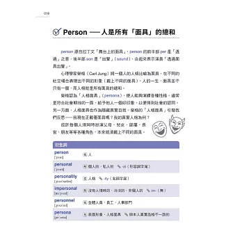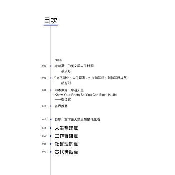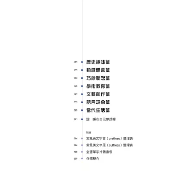 學會字根、字首、字尾的組合是英語字彙學習的利器,本書提供淺顯易懂的說明,讓讀者學習字根的同時,進一步知曉相關典故與意涵。作者精鍊的筆法,使枯燥的字根學習成為充滿哲思與令人享受的閱讀之旅。這真是一本令人回味再三的書,我從沒想過字根的學習可以如此地充滿趣味!──林子斌(國立臺灣師範大學教授/高等教育國際合作基金會執行長)