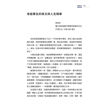 在這個AI 蔓延、知識快速複製的時代,這是一本唯有無止境大量閱讀、歷經人生淬鍊、依然懷抱熱血與善良初心的我的父親,才有可能寫出來的書。它集結了爸爸喜歡的歷史、哲學、神話、文學、電影、體育等領域,透過不斷交融畢生所學與英文專業,再藉由他最重視的「品格」貫穿。──蔡承妤(國立南投高級中學應用英語科主任/作者之女/多益990 滿分)推薦序摘錄