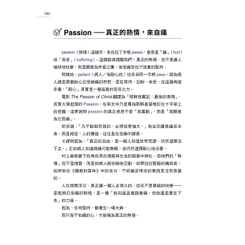 passion(熱情)來自字根pass,是痛(hurt)和受苦(suffering)之義。真正的熱情,像生一場病,要走過一次次痛苦的考驗。
