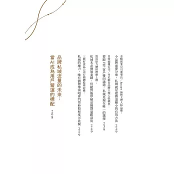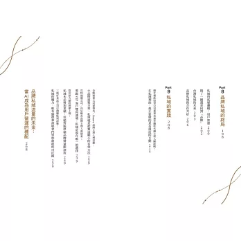 書中收錄多個品牌的私域經營案例,深入分析其成功關鍵與背後策略,搭配實用圖表,找出高效運用的私域的最佳模式。