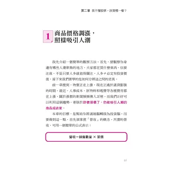 另外,作者也指出,敢漲價、不怕流失客戶的企業,往往值得投資。一般來說,企業不太會輕易調漲價格,因為消費者普遍有「哪裡便宜往哪裡去」的心態,習慣貨比三家。但企業若具有市場獨占地位,即使商品漲價,消費者仍願意買單,這也意味著其股價未來具成長潛力。