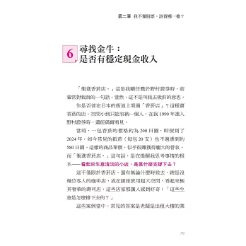 而作者帶我們看見,漲價後依然人山人海的迪士尼樂園,背後蘊藏著驚人的賺錢潛力;也從過去的越南街道上,騎機車但沒人戴安全帽的情況,聯想到一家安全帽大廠的未來商機。讀完後我發現,平凡的日常風景,都成了挖掘投資寶藏的地圖。