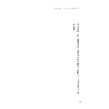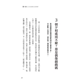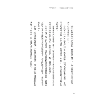 看了和田秀樹醫師在書中主張的「若即若離夫妻」,我終於可以理直氣壯:「我們這樣沒問題。」我特別喜歡書中一句話:「丟掉『應該』,人生馬上順眼。」我先生雖然沒有理想老公「應該有」的特質,但他給了我信任與自由,而他的創業執行力是我沒有的,想對婆婆盡心也是我認同的。