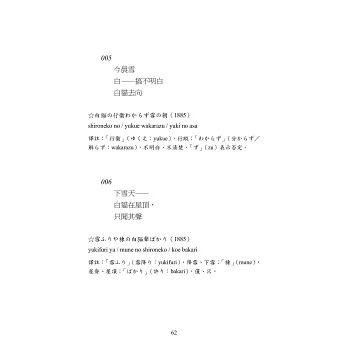 本書從正岡子規所寫下的上萬首俳句中,精選翻譯500首,按年代先後編排,並附上原文、讀音及註解,供讀者品味鑒賞。