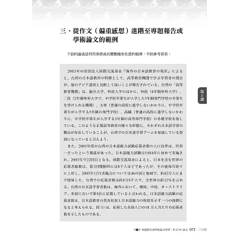 秋桂老師與落合老師合著的《我的第一堂日文專題寫作課》是國內少有專門介紹日文研究報告與論文寫作的教材。許多學生在撰寫日文時常不清楚基本格式,如標點符號的使用、註腳、引用方式等,這本書正好為此提供清晰的說明與範例。