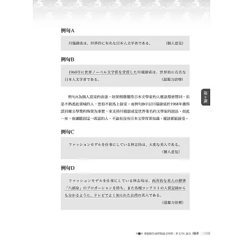 撰寫專題報告或學術論文時,常會用到許多固定的日文句型,像是表達贊成意見的句型「~~~~の論説は~~~~傾聴すべきである」,或是說明製作圖表用意的句型「~~は図1(表1)に纒めることができる」等等,這些好用、慣用的日文常見句型全部蒐集於附錄中,讓您不僅查詢方便,更能靈活運用於專題報告或學術論文中!