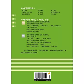 有鑑於此,有了您手上的這本《日文論文寫作寶典》。本書分為「初級」和「進階」,其中《日文論文寫作寶典  初級》是教授如何撰寫研究計畫書(或企畫書),而《日文論文寫作寶典  進階》則是教授以研究計畫書(或企畫書)為根基,延伸完成論文。閱讀本書,有助於從無到有創造出有形的研究計畫書(或企畫書),甚至攻頂完成論文。本書曾幫助過日文系或非日文系許多莘莘學子們赴日攻讀博士學位,實現夢想。夢想並非遙不可及,但如果沒有此基本功夫的論文寫作訓練邏輯推論,即使可以運用AI技術,或者AI再厲害,也很難被AI大師度化。