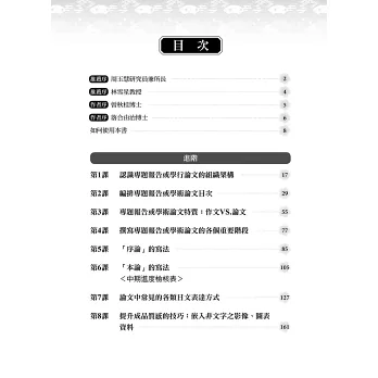 在撰寫論文之前想要多方參考一下前人的論文?不需要上圖書館,本書蒐集了數篇目次、序論、結論範例,學習完課程內容,立即能參考應用!例如第12課中所列舉出的「結論」基本版與進階版寫作模式與範例,參考價值高!