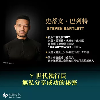除了豐富的創業、投資與行銷經歷,他還主持廣受英國與歐洲聽眾歡迎的播客節目「The Diary Of A CEO」,並在過去四年,針對全球眾多商業界、體育界、娛樂界和學術界的頂尖人士,進行了超過700小時的訪談。透過親身經歷與深度對話,史蒂文見證了高潮和低谷,分析失敗的時刻和成功的模式,並從中淬鍊出一套能應用於任何行業、可供追求卓越成就的人們參考的33條基本法則。