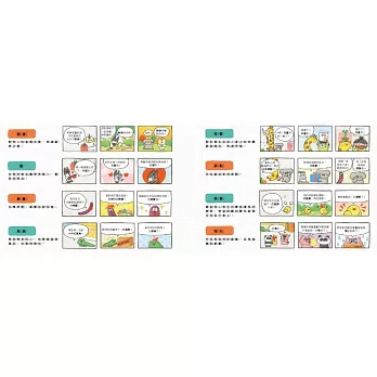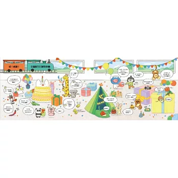 每節車廂情境之後,延伸出16種詞彙,以可愛的角色在不同狀況下的對話為範例,讓孩子理解這些詞彙如何適時適地的表達。