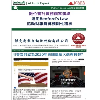 本講義由國際認證的專業顧問團隊精心編撰,提供完整的公開財報數據分析與上機實作,幫助審計人員及投資者提前發現潛在舞弊風險,避免投資於地雷股。JCAATs 為Python-Based AI 新世代稽核軟體,針對傳統審計軟體在 Benford’s Law 應用上的操作難點進行優化,包括一鍵卡方檢定、可自訂數據開始位數與信賴區間等,讓審計人員可以更輕鬆與深入運用Benford’s Law,並內建 AI 智能查核指令,如 OPEN DATA 爬蟲、機器學習、文字探勘與影像分析等,進一步提升審計的準確度與效率。