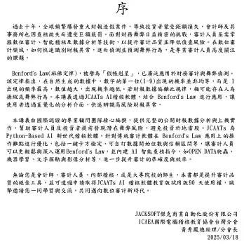 本書正是少見將Benford’s Law(班佛定律)理論落地應用的完整教材,從數據分布的原理、實例解析到AI軟體操作,層層鋪陳、環環相扣,不僅具備學術深度,更強調實務演練。JCAATs稽核軟體的導入,使得複雜的數字檢測過程得以簡化,讓非資訊背景者,也能輕鬆掌握。