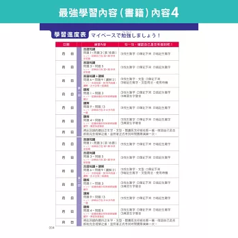 本書附贈每日學習進度表及考前關鍵進度表,只要你每天預留30分鐘練習18題,固定做一點學一點,按表操課,便能日積月累,30天就能見效,原來N1合格也可以這麼簡單。