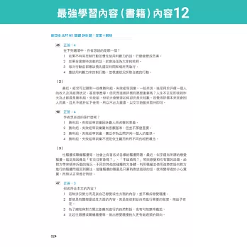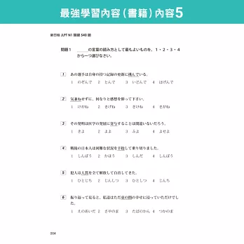 5回新日檢N1全真模擬試題皆仿照日本語能力測驗(JLPT)規格,包含題數、範例題、出題方向及難易度……等,臨摹考場的考試流程,平時練習就能具有臨場感,正式上場不緊張。