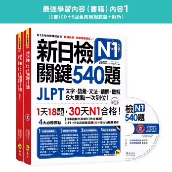 1. 《新日檢JLPT N1關鍵540題:文字、語彙、文法、讀解、聽解一次到位》,書籍(5回全真模擬試題+解析)、CD