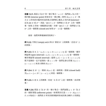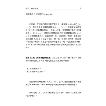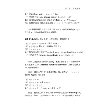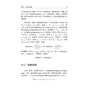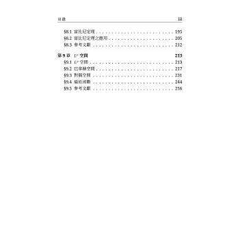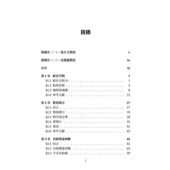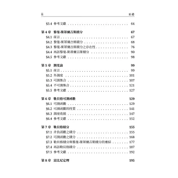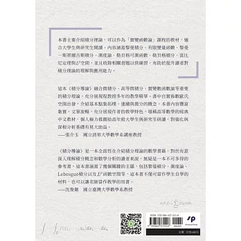本書的編寫共分九章,包含了黎曼積分,有限變量函數,黎曼-斯蒂爾吉斯積分,測度論,勒貝格可測函數,勒貝格積分,富比尼定理與Lp空間。黎曼-斯蒂爾吉斯積分把積分因子從自變數x推廣到一般的函數α(x)。勒貝格積分則是一套新的理論把可積分的函數空間變大,達到我們實際討論與研究上的需求。這本書適合大學生與研究生來閱讀。也可以作為實變函數論課程的教材。因此,在每一章也刻意收集了一些相關的問題以供學生們複習與練習用,達到相輔相成的效果。我們同時也希望它能有助於培養一般高中生與大學生對積分理論的數學素養。