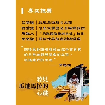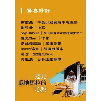 【如果把古文明的神秘、拉丁人的熱情、自然世界的野性,再加上一點點台灣的人情味,會是怎樣的樣貌呢?很高興如此精彩且輕鬆閱讀的書籍,能夠以台灣人的筆書寫出來,呈現在大眾眼前。讓台灣的讀者就算無法前往瓜地馬拉,也能夠透過書本,領略她的魔幻魅力。】