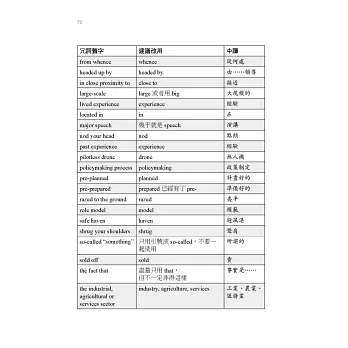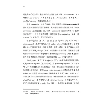 第六章開始探究細節,逐一講解重要單字。我翻譯時力求文字清楚易懂。讀者可視各自需求瀏覽內文。此處稍微提幾個有趣的條目。在美國,quite是一個強化副詞,類似於very;在英國,它通常表示moderately或reasonably,所以用它修飾某個字,通常不是讚美。動詞table在英國的意思是提出某件事來採取行動,但是在美國,情況恰好相反,表示擱置。此外,若要用administration表示國家的政治領導層,最好只用來指實行總統制的國家,尤其是美國。採行議會制的政府可用government,而administration可以指常任的行政部門。cartel(卡特爾/同業聯盟)是控制供應以抬高售價的團體,別用它描述舊的syndicate(辛迪加/財團)或一群生產者(特別是毒販),除非他們做出卡特爾的行為,亦即集體哄抬價格。Frankenstein(法蘭根斯坦)是小說《科學怪人》的那位瘋狂科學家,不是他製造的怪物。那隻怪物的名稱是Frankenstein’s monster(法蘭根斯坦的怪物),小說常以「生物」、「魔鬼」、「東西」和「不幸者」稱呼它。