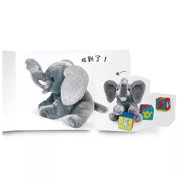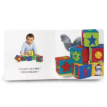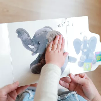 除了感官刺激和翻頁預測的互動之外,也很適合作為指物命名、看圖說話的啟蒙圖畫書。在共讀的過程中,你可以念出書中的句子,例如:「大耳朵的大象在哪裡?在積木的後面嗎?」讓孩子根據你的提示,觀察每一頁畫面,然後自己打開翻頁,享受「找到了!」的趣味。透過互動、有趣的閱讀歷程,培養寶寶思考和記憶的能力,讓寶寶動動手、也動動腦喔!