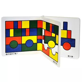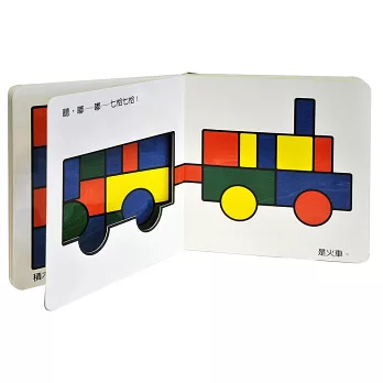 看到色彩繽紛的封面,就叫人忍不住愛上它;一打開內頁,哇!超神奇的一本遊戲書,因為它會移動。紅、黃、藍、綠四種色彩,搭配正方形、長方形、拱形、圓形、三角形等形狀,移動的積木可以變化出哪些內容呢?汽車、公共汽車、火車、輪船……等各種孩子喜愛的交通工具,還有嗎?就等你和孩子一起玩囉!