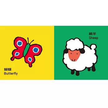 本書八個中英雙語的單字,皆取材自孩子生活中常見的動物和日常用品,搭配輪廓清晰、色彩明亮飽和的圖案,非常吸引寶寶的目光,是孩子學習語言初期,練習指物命名的好伙伴。一起讓多元的感官閱讀經驗,在寶寶心中埋下愛書的種子,展開愉快的閱讀旅程!