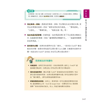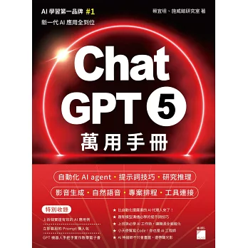 本書完整蒐羅各種官方、非官方的 ChatGPT 功能技巧, 榨出 GPT-5 的應用極限, 精心設計合理的提示詞與操作範例, 充分展現新模型的潛在威力, 跟你一起煉成辦公室、研究室、Lab 實驗室不可或缺的各種 AI 活用技。