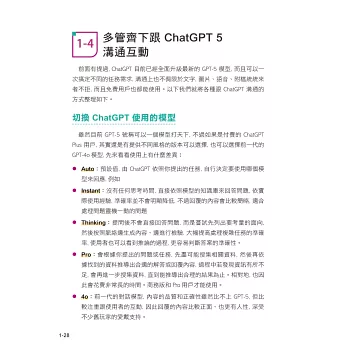 ChatGPT 5 將各種不同功能的模型整併在一起, 懂得跟 AI 好好溝通, 把問題和需求說清楚, 才能有正確、高品質的回應成果。而且模型雖然統一了, 但 ChatGPT 提供多達 10 多種對話模式和輔助功能, 根據適當的情境選用對的工具, 才能讓 AI 成為你最佳助手, 不會反覆空轉、拖慢你的腳步。