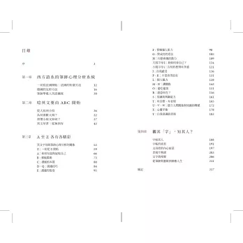 「技巧」二字聽起來讓人有點卻步,似乎需要花長時間學習。筆跡心理分析從來都是一項循證實踐的學習,屬經驗之談,若花了時間卻只了解皮毛,難免會令人失望。有見及此,我從使用者的角度出發,回到基本步,從英文字母開始討論筆跡心理分析。二十六個英文字母雖形態各異,實際上卻蘊含著特定的意義。不論大寫或小寫,還是書寫工具的選擇,都有不同的暗示。本書以這二十六個字母為主,附以不同的字母書寫形態,方便大家作對比,從中找出與自己寫法相似的字形,了解自己隱藏的性格特質。
