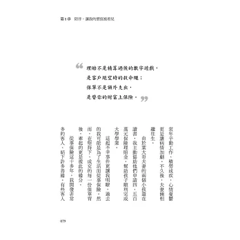 2008年從零經驗轉戰保險業,前3個月業績掛零,仍接手業務最不想做的校園理賠,而這竟成了她翻轉人生的起點──從一張張小保單,簽出大訂單,更以實在的理賠金,陪伴無數家庭度過生命中最艱難的時刻。