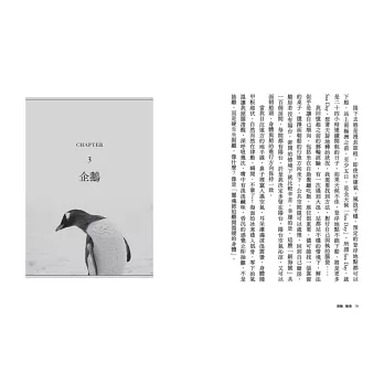 從福克蘭群島、南喬治亞島、南極半島,到象島與欺騙島,平路近距離描寫不同企鵝的習性與情感世界,也不忘凝視人類對自然的影響與掠奪。她筆下的國王企鵝、帽帶企鵝、巴布亞企鵝、跳岩企鵝,不僅是生物觀察的對象,更是人性投射的鏡像。