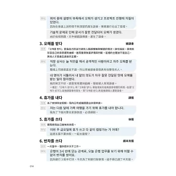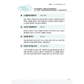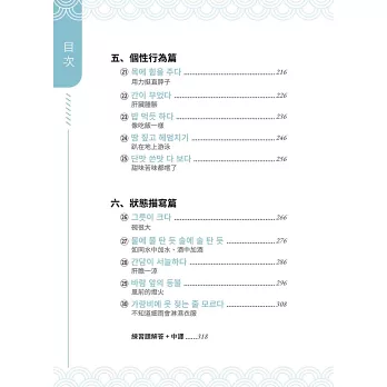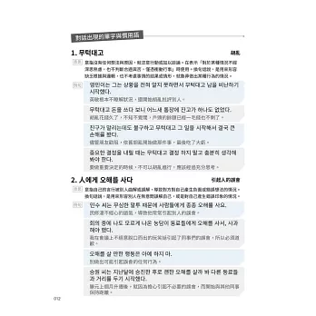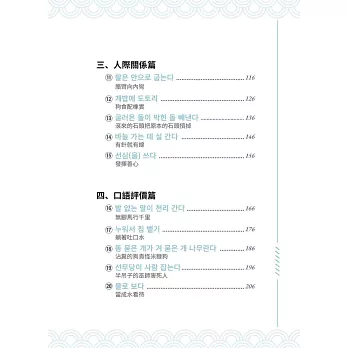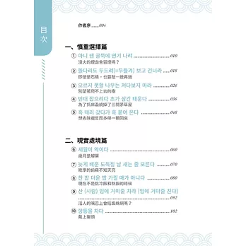 本書規劃慎重選擇、現實處境、人際關係、口語評價、個性行為、狀態描寫共6大篇主題,並挑選出30個常見慣用句作為主要學習句,全書超過150組慣用表達,藉由大量例句掌握使用語境,熟悉韓國人的思考邏輯!