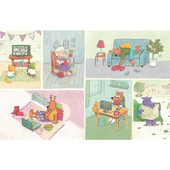 此書為曾榮獲智利國際兒童讀物聯盟(IBBY Chile)大獎的知名插畫師迪耶哥.德.阿勒納首次擔綱全書文圖創作的繪本作品。畫面以柔和的粉彩色調鋪陳,搭配手繪感的紋理,讓人一眼就感受到親切與放鬆。書中每一頁都投射著社區日常的縮影,充滿幽默細節的圖文,讓人忍不住細細端詳,一次又一次重溫這個故事。