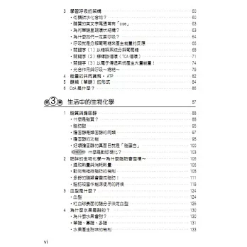 ★生物化學就在你身邊: 為什麼水果是甜的?年糕為什麼有彈性?血型又是怎麼回事?本書特別設立「生活中的生物化學」章節,透過「肥胖」、「血型」、「食物甜度」等日常議題解答日常生活中的各種為什麼!