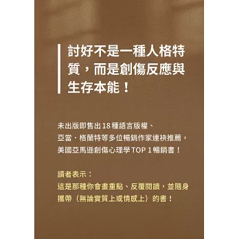 作者探討了鮮為人知卻「可說是最常見」的生存反應:討好,並巧妙融合了臨床專業知識、個人剖白與相關案例研究,成就了這部獨具匠心的睿智之作。──《新聞週刊》