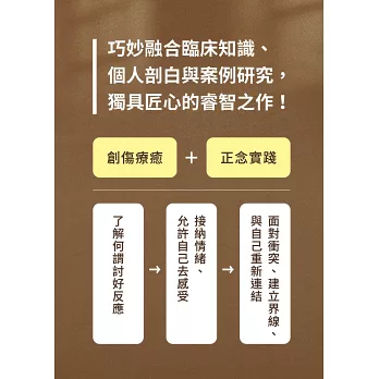 本書帶你用一直渴望、卻以為自己不配擁有的關愛,溫柔地擁抱你;卸下那些讓我們被困在過去、無法真正活在當下的保護機制,釋放「必須犧牲自己以成全他人」的牢固信念與阻礙。作者引領我們在內心深處培養出堅實的安全感,即使外在世界失序、一切看似失控時,我們仍能擁有靜謐且溫暖的歸宿,安然回到自我之中。