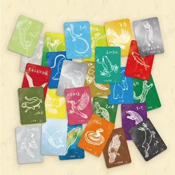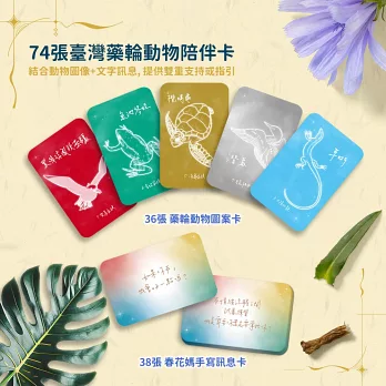 ✦74張全彩牌卡,包含:「臺灣藥輪動物圖案卡」36張、「春花媽手寫訊息卡」38張。